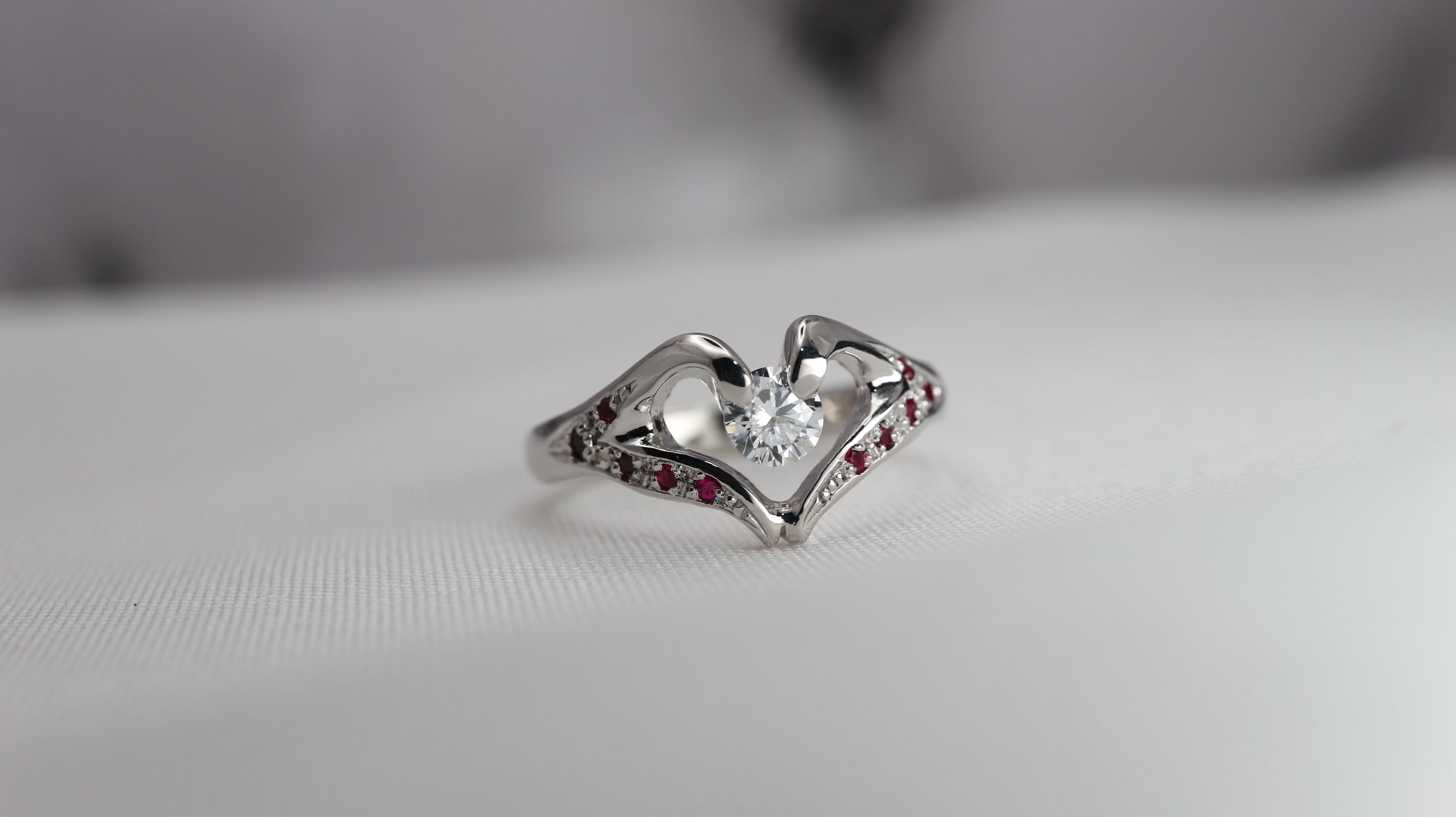 ダイヤモンドを留めている2本の爪は、二人でハートマークを作っているイメージのハートデザインリングです。