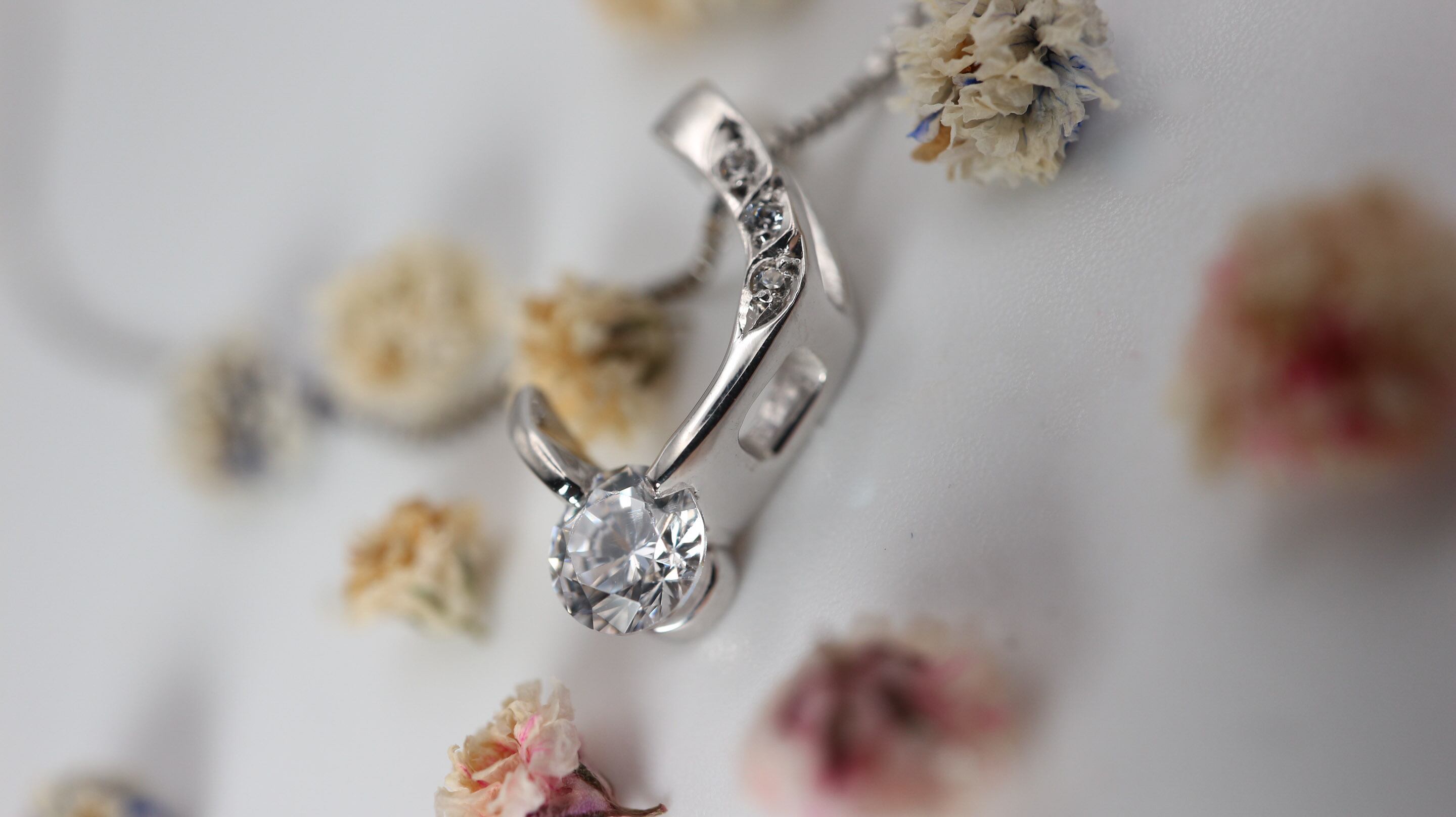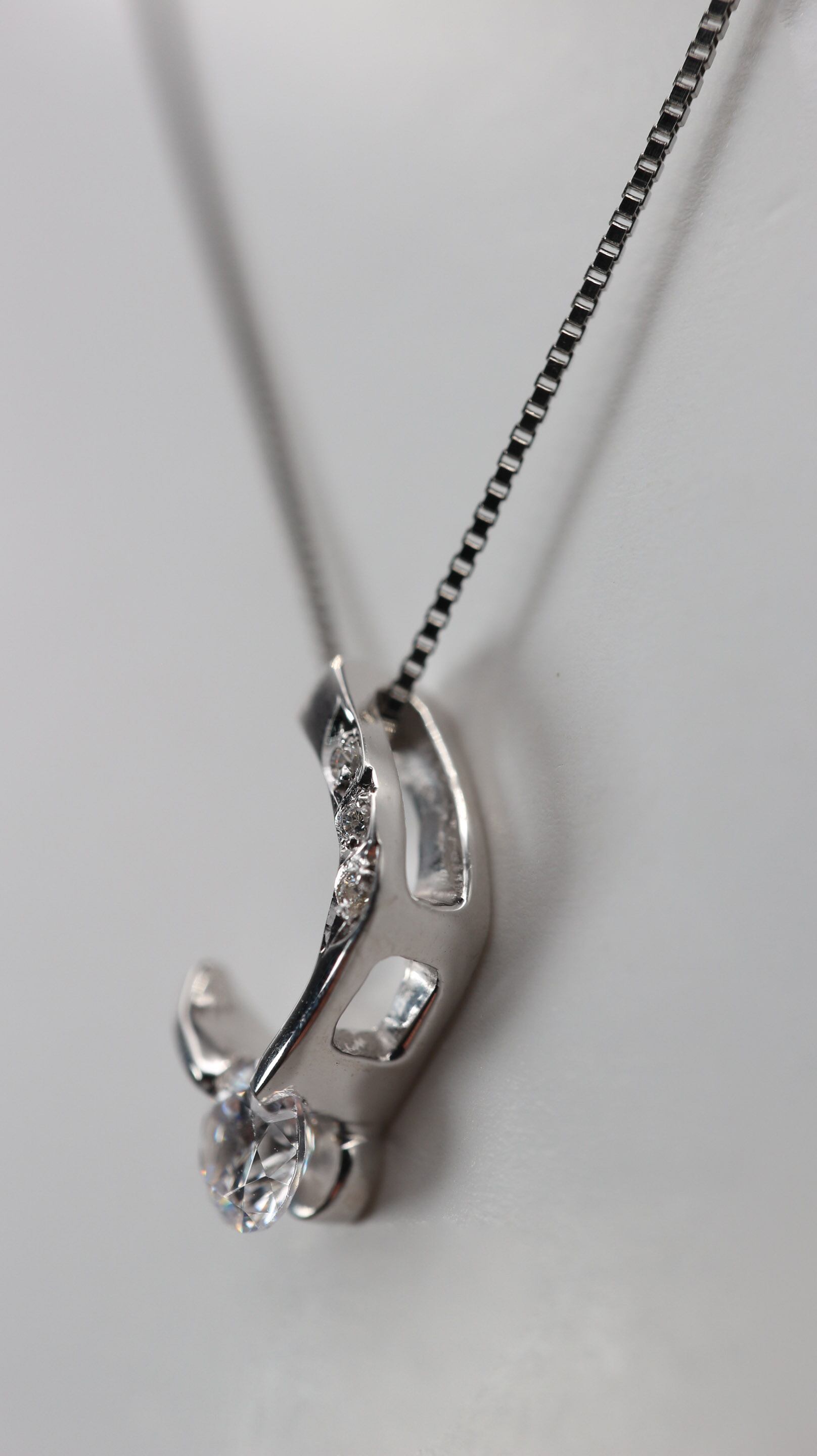 ユニークな釣り針デザインが特徴の0.2ctダイヤモンドの二点留めネックレスです。