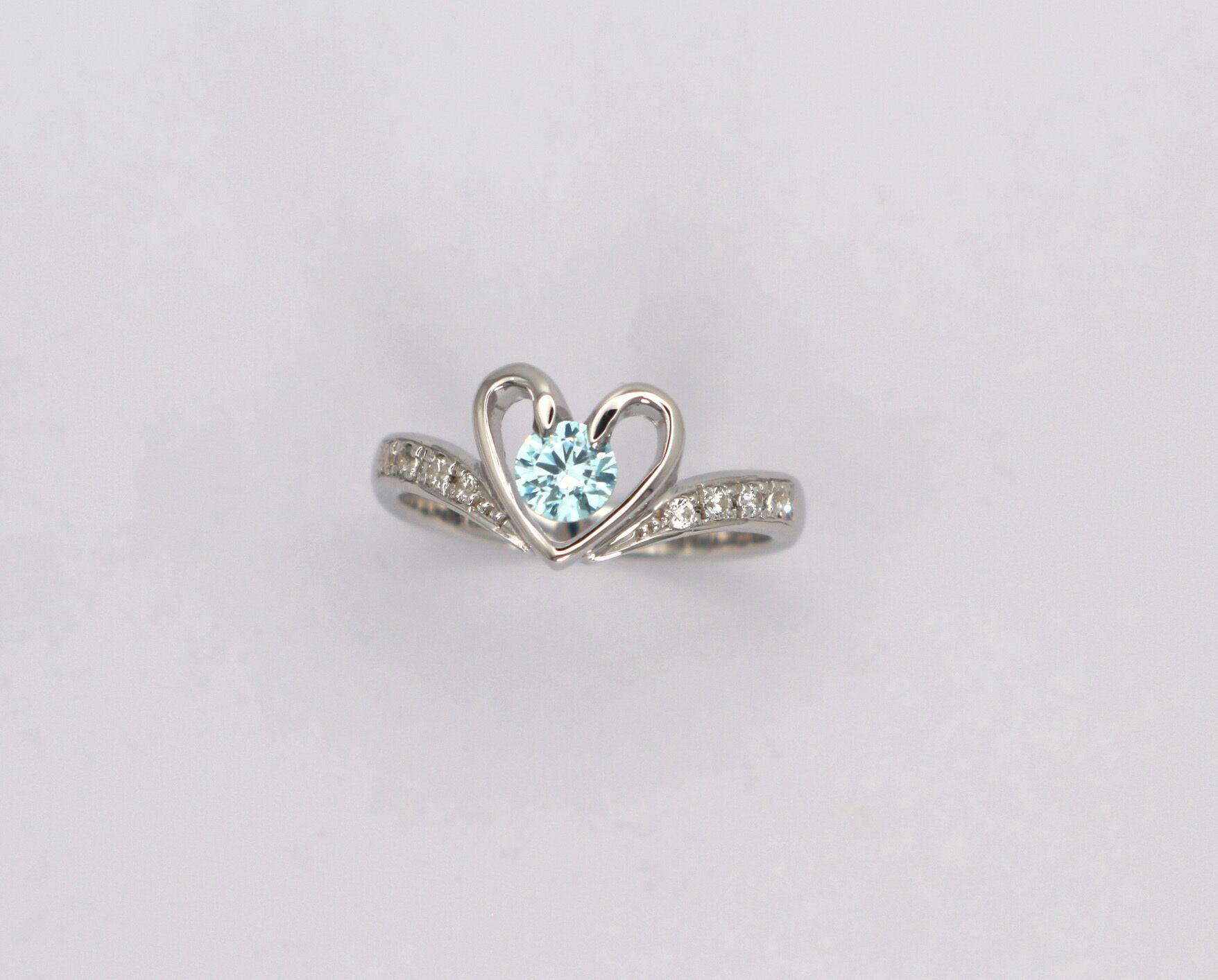 ブルーダイヤをセンターに留めた、ハートデザインリング。